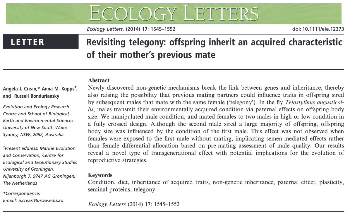 Но в 2014 году исследование, опубликованное в журнале Ecology Letters, вновь обратилось к телегонии и подтвердило ее в неожиданном месте: плодовых мухах.