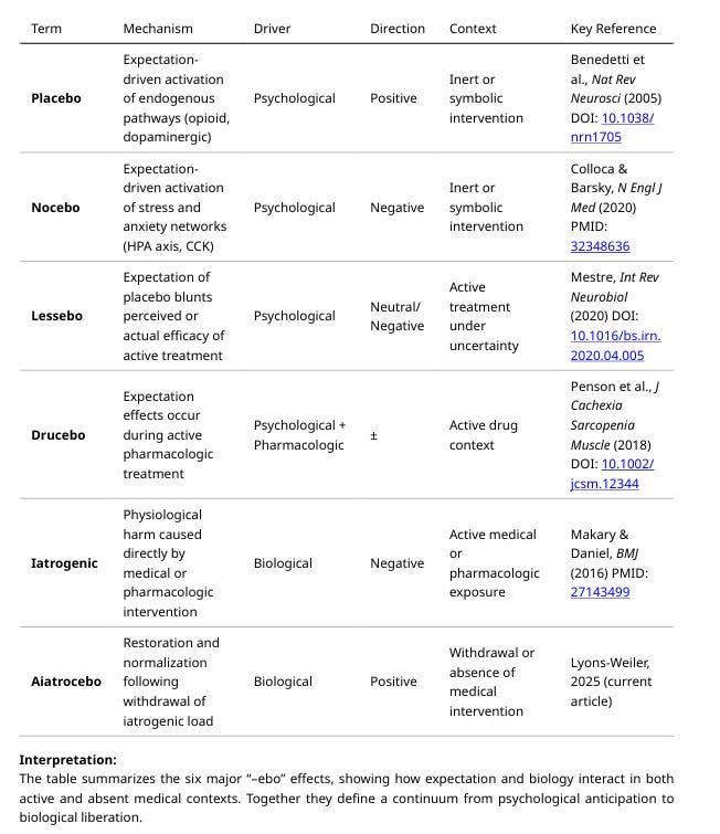В этой таблице классифицированы шесть основных феноменов –ebo (плацебо, ноцебо, лессебо, друсебо, ятрогенный и айатроцебо) в соответствии с их доминирующими механизмами, движущими силами и направленными результатами.