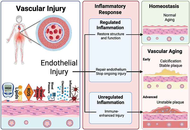 Схема повреждения сосудистого сосуда под воздействием химических стрессоров, сдвиговых сил или реактивных видов кислорода (ROS), приводящих к повреждению эндотелиа. Воспалительная реакция начинается как регулируемое воспаление, что желательно приводит к восстановлению структуры и функций; Восстановление эндотелия может привести к раннему сосудистому старению, как это наблюдается при кальцификации и стабильном образовании бляшек, а нерегулируемое воспаление, вероятно, с иммунно-усиленным повреждением, может привести к позднему сосудистому старению и нестабильному образованию бляшек.